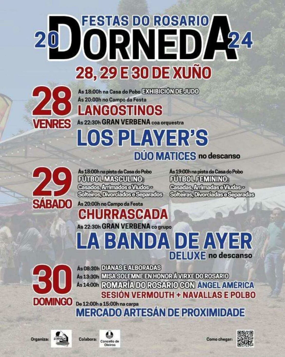 El viernes 28 comenzará la jornada a las seis de la tarde con un exhibición de judo en la Casa do Pobo y después, a las ocho, habrá una degustación de langostinos en el campo da festa. Por la noche, a partir de las diez y media, estará la orquesta Los Player’s en la verbena y el Dúo Matices en el descanso.